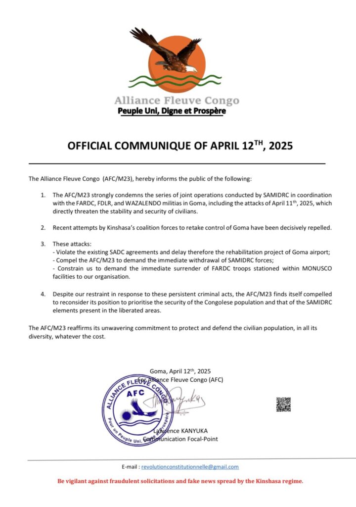 The Alliance Fleuve Congo (AFC/M23) accuses SAMIDRC of actively participating in the attacks of April 11, 2025, in an official statement released on April 12, 2025. This accusation marks a significant escalation in the ongoing conflict in eastern Democratic Republic of Congo (DRC).
